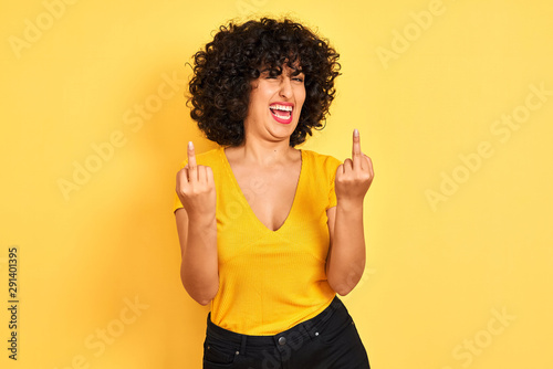 Young arab woman with curly hair wearing t-shirt standing over isolated yellow background Showing middle finger doing fuck you bad expression, provocation and rude attitude. Screaming excited