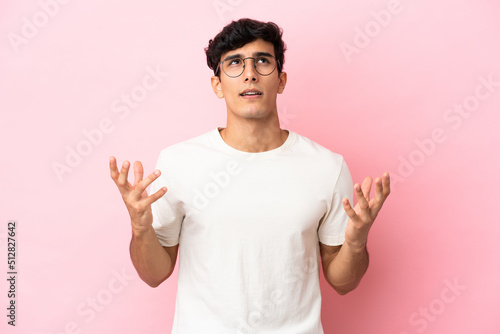 Young Argentinian man isolated on pink background stressed overwhelmed