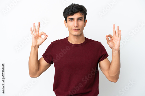 Young Argentinian man isolated on white background in zen pose