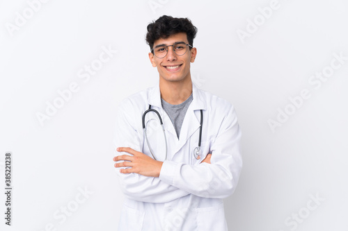 Young Argentinian man over isolated white background wearing a doctor gown and with arms crossed