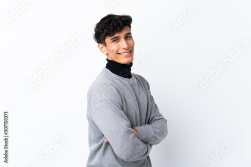 Young Argentinian man over isolated white background with arms crossed and happy