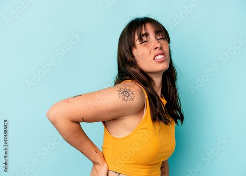 Young Argentinian woman isolated on blue background suffering a back pain.