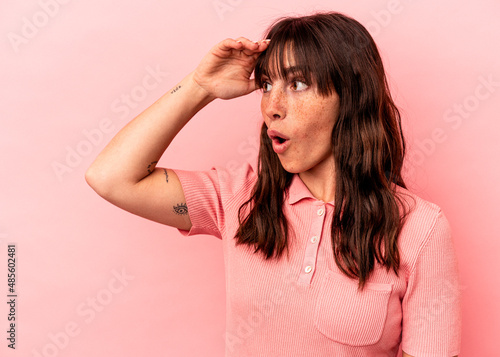 Young Argentinian woman isolated on pink background looking far away keeping hand on forehead.