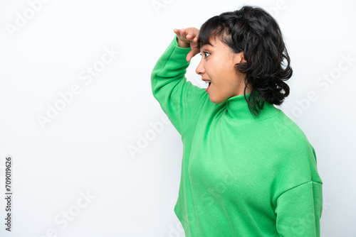 Young Argentinian woman isolated on white background with surprise expression while looking side