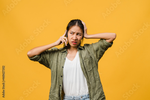 Young Asia lady talk by phone with negative expression, excited screaming, cry emotional angry in casual cloth and stand isolated on yellow background with blank copy space. Facial expression concept.