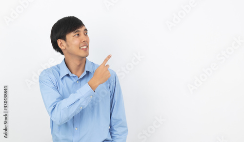 Young asian business man with blue shirt pointing to the side with a hand to present a product or an idea isolated on white background.