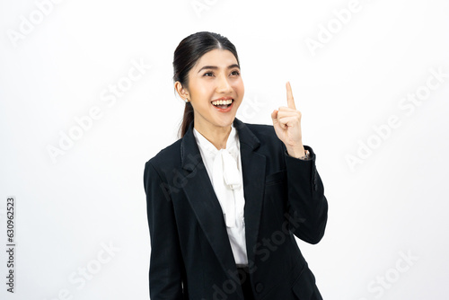 Young asian business woman happy smiling pointing finger to blank space on isolated white background. Female around 25 in suit portrait shot in studio.