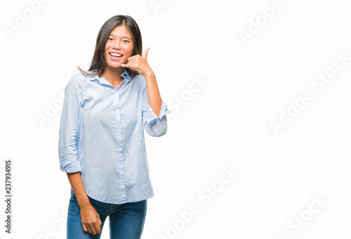 Young asian business woman over isolated background smiling doing phone gesture with hand and fingers like talking on the telephone. Communicating concepts.