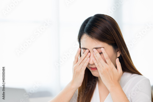 Young asian business woman rubbing her eyes she's feeling depressed stress headache be tired from working with laptop a long time she symptom office syndrome.