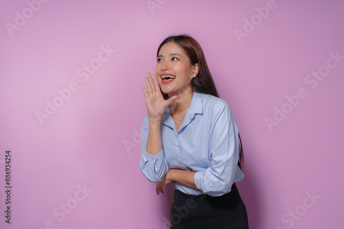 Young asian businesswoman whispers a secret against a pink backdrop, exuding confidence and professionalism, ideal for marketing