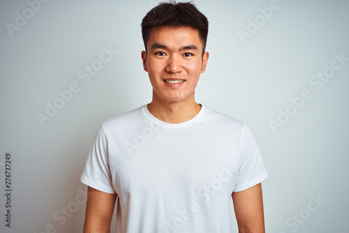 Young asian chinese man wearing t-shirt standing over isolated white background with a happy and cool smile on face. Lucky person.