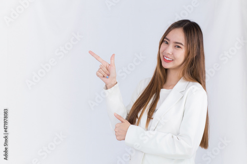 Young Asian cute woman in white suit acts exciting and point up to present something on white background.