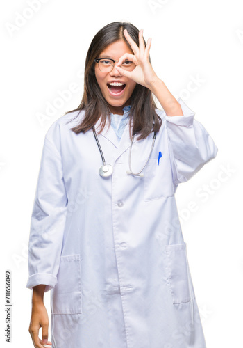 Young asian doctor woman over isolated background doing ok gesture with hand smiling, eye looking through fingers with happy face.