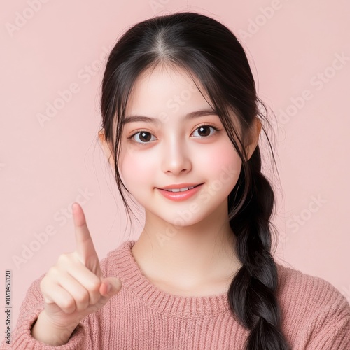 Young Asian girl points her finger, cutout shape.