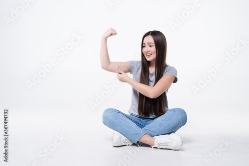 Young asian girl sitting on the floor feeling happy, satisfied and powerful, flexing fit and muscular biceps isolated on white background