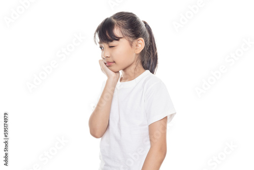 Young Asian girl touching mouth with hand with painful expression because of toothache or dental illness on teeth. Dentist concept.