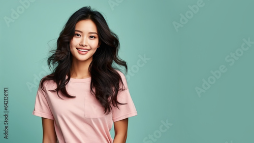 Young Asian japanese woman with long black hair, perfect facial skin, cosmetic advertising products salon shampoo hair care