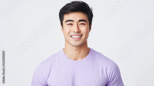 Young Asian man in a lavender t-shirt smiling at the camera. Studio shot on a plain background, emphasizing his cheerful expression and casual style.