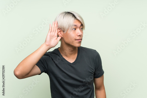 Young asian man over isolated green background listening to something by putting hand on the ear