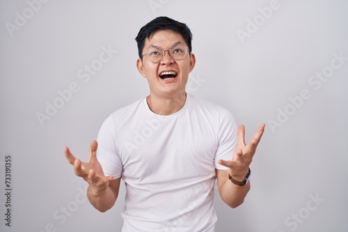 Young asian man standing over white background crazy and mad shouting and yelling with aggressive expression and arms raised. frustration concept.