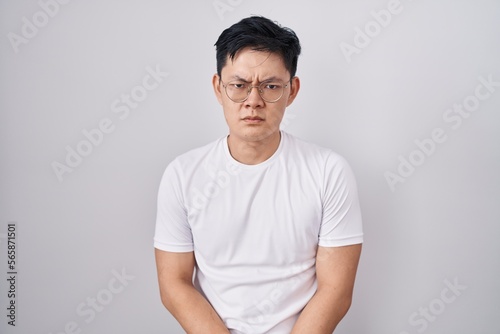 Young asian man standing over white background skeptic and nervous, frowning upset because of problem. negative person.