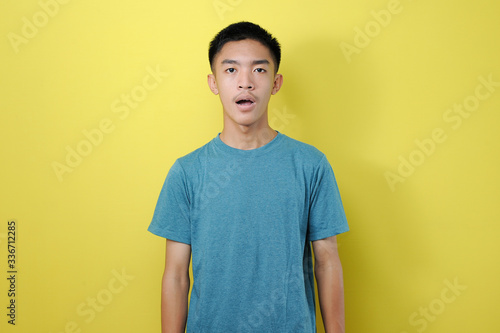 Young asian man was dumbfounded look at camera, his mouth open, silent expectation