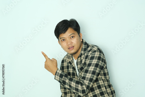 Young Asian man wearing brown flannel shirt looking camera with worried expression while pointing behind