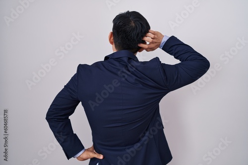 Young asian man wearing business suit and tie backwards thinking about doubt with hand on head