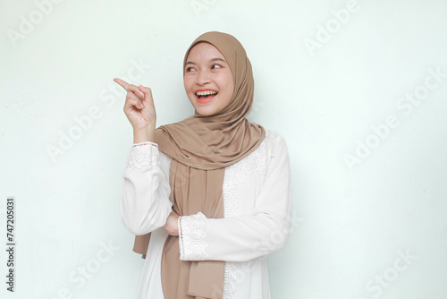 Young Asian Muslim woman wearing hijab, sweet smiling while pointing and showing to copy space beside her. Isolated in gray background.