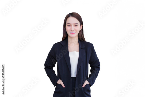 Young asian professional working businesswoman wearing black suit success standing pickpocket and smiling at work office happily while isolated white background.
