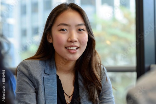 Young Asian woman being interviewed for a managerial position in a professional office setting.