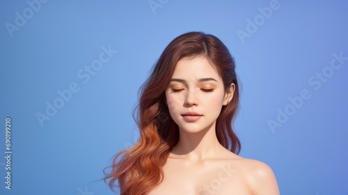 Young Asian woman closed eyes with a smile while standing in a studio