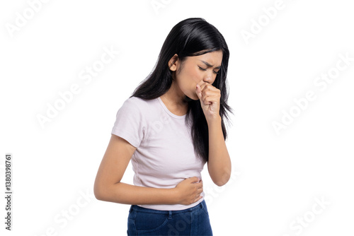 Young Asian woman coughing with hand covering mouth, suffering from dry cough or respiratory issue, isolated on transparent background