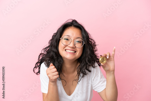 Young asian woman holding a Bitcoin isolated on pink background celebrating a victory in winner position