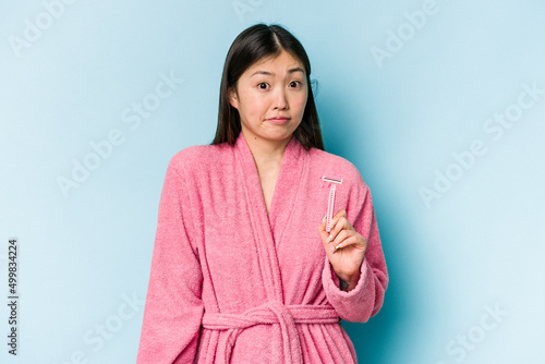 Young asian woman holding razor blade isolated on blue background shrugs shoulders and open eyes confused.