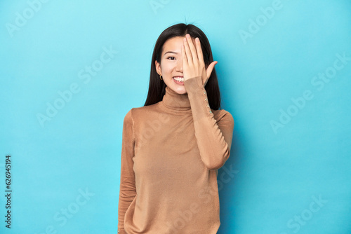 Young Asian woman in brown turtleneck, having fun covering half of face with palm.