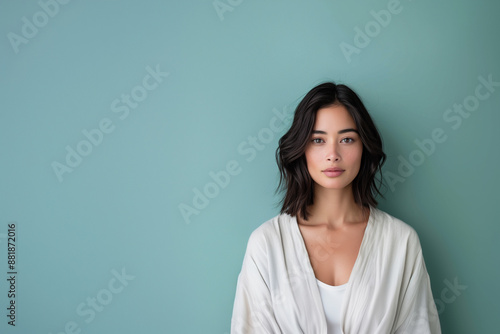 Young Asian woman in casual white attire, standing against a light teal background. Her look is fresh and natural, reflecting simplicity and elegance.