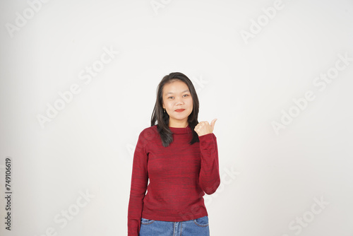 Young Asian woman in Red t-shirt Pointing side at copy space with thumb isolated on white background