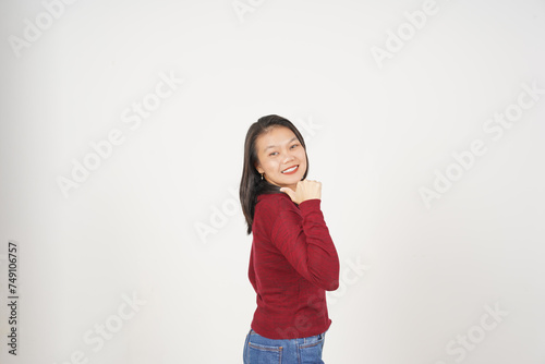 Young Asian woman in Red t-shirt Pointing side at copy space with thumb isolated on white background