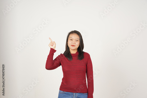Young Asian woman in Red t-shirt pointing side copy space isolated on white background