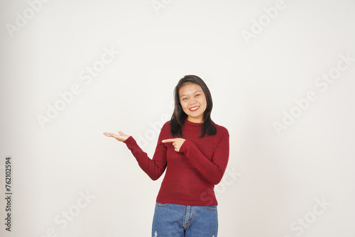 Young Asian woman in Red t-shirt Showing and holding on open palm copy space isolated on white background