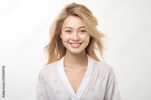 Young Asian woman in serene smile, wearing white relax pajamas against a plain white background. Generative AI.