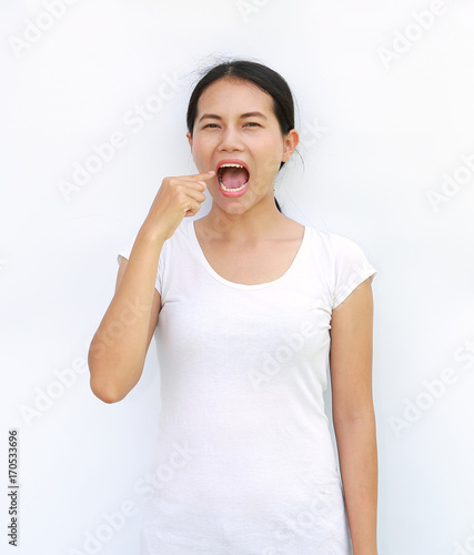 Young asian woman in T-Shirt Showing expression open her mouth.