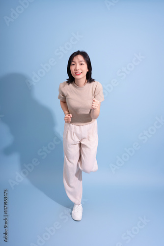 Young Asian woman jogging in comfortable attire on a light blue background during a fitness session
