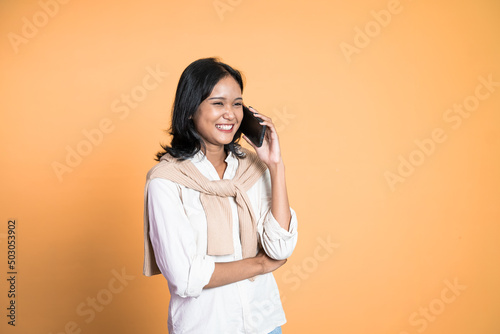 Young asian woman making a call using a cell phone on isolated background
