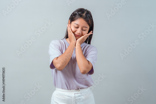 Young Asian woman making a cute gesture with both hands under her chin while smiling and closing her eyes. She wears a lavender shirt and white pants, studio shot.