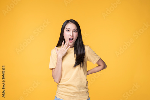 Young Asian Woman making Hand gesture with Surprise Face. Happy Asian Woman wearing Yellow T-shirt standing over yellow background. Portrait of Happy Asian female.