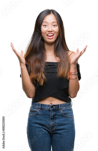 Young asian woman over isolated background celebrating crazy and amazed for success with arms raised and open eyes screaming excited. Winner concept