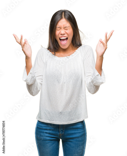 Young asian woman over isolated background celebrating mad and crazy for success with arms raised and closed eyes screaming excited. Winner concept