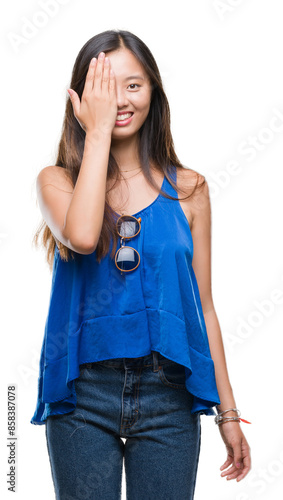 Young asian woman over isolated background covering one eye with hand with confident smile on face and surprise emotion.